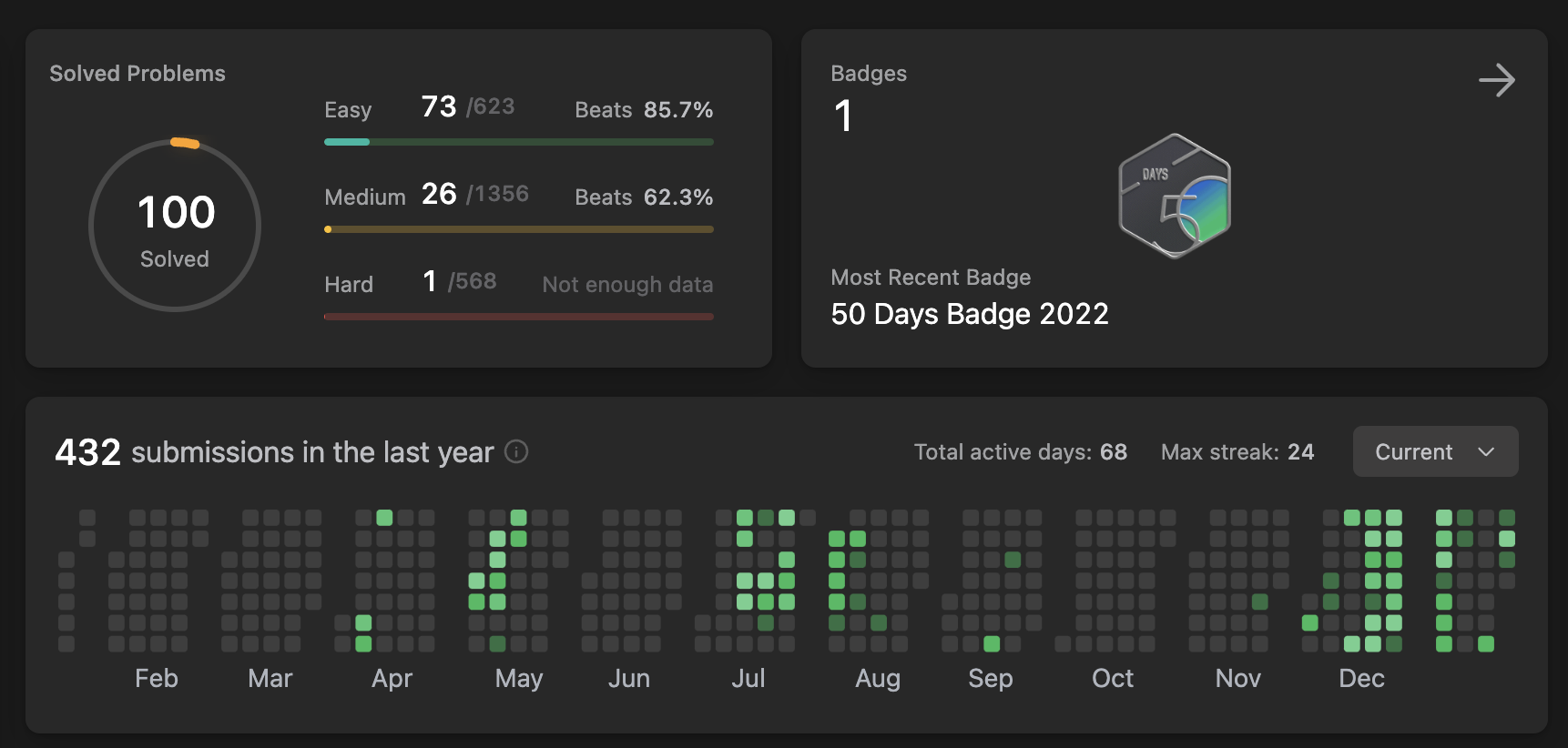 역시나 아직 미천한 실력이기에 Easy 위주로 풀었지만, 앞으로 점점 실력이 늘어날거니 신경쓰지 않고 200문제를 향해 가야겠습니다.
